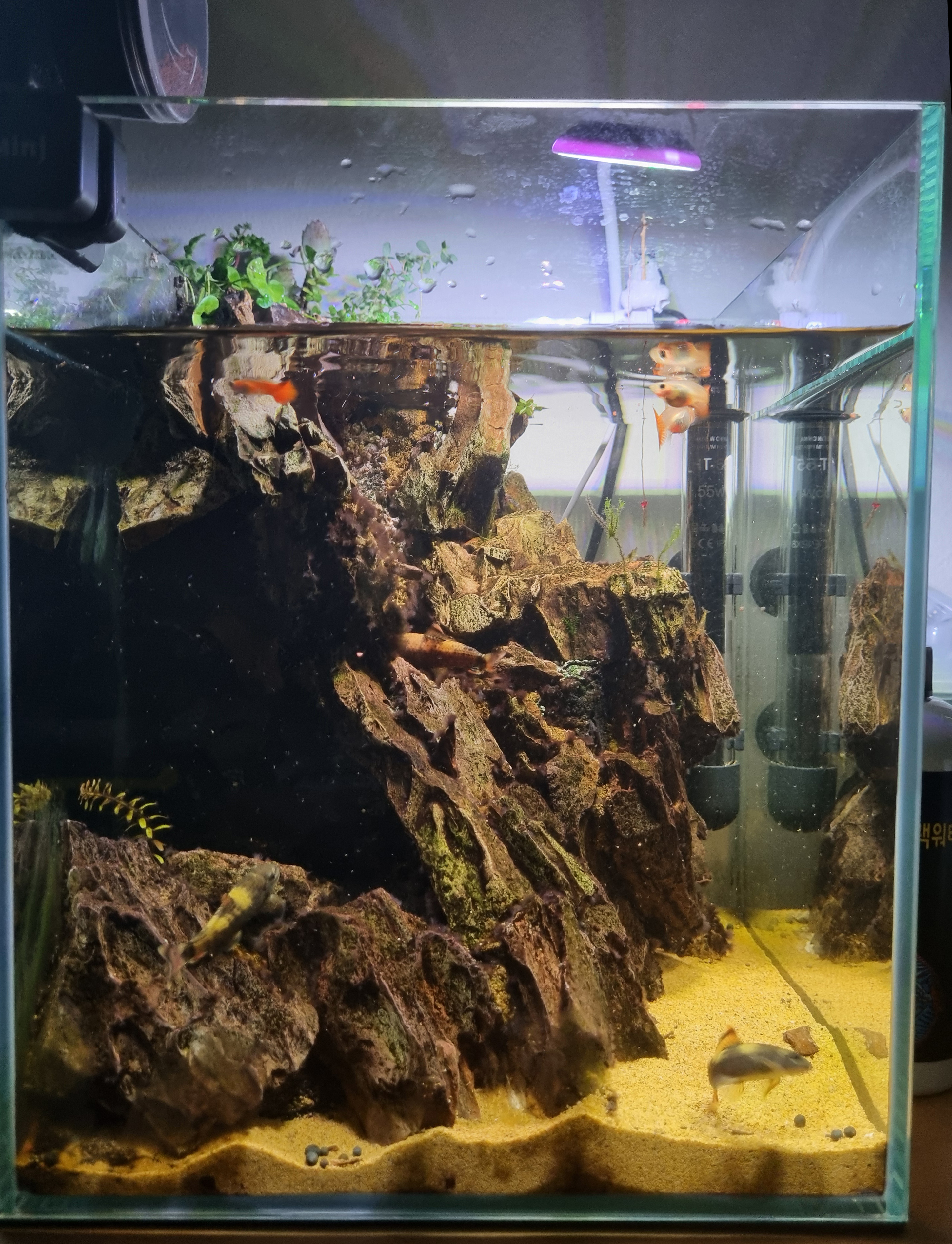 황호석으로 조경세팅한 어항에 현재 구피, 가라루파, 생이생우가 함께 살고 있죠.