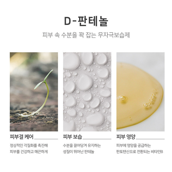 D-판테놀은 피부의 수분을 유지하고 피부 장벽을 강화하는 데 큰 도움이 됩니다.