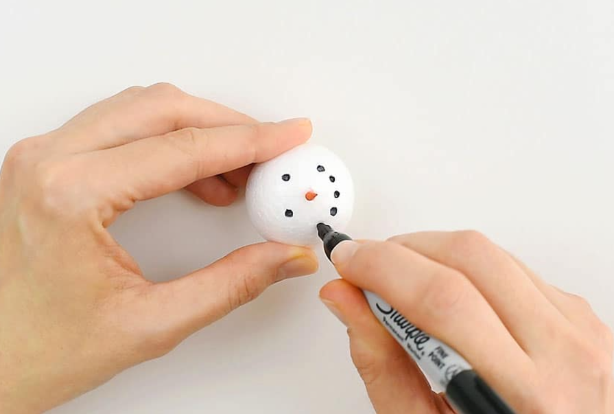 오렌지 마커로 대나무 꼬치 끝부분을 색칠해 코 모양을 만듭니다. 이후 스티로폼 공에 꽂아 눈사람의 코를 완성합니다.