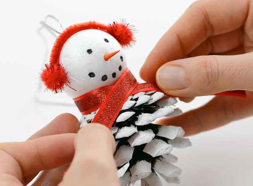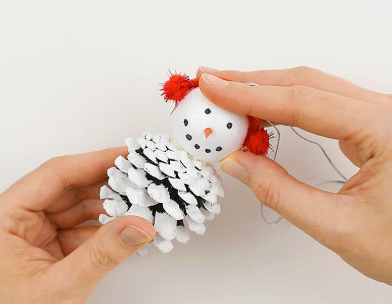 눈사람 머리를 솔방울에 단단히 고정합니다.