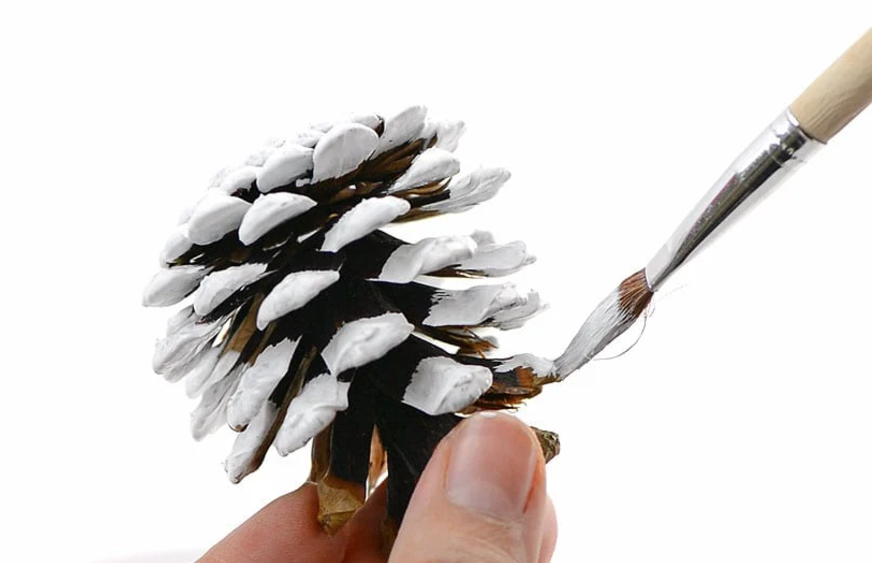 먼저 솔방울의 끝부분을 흰색 아크릴 물감으로 칠합니다. 꼭 눈이 쌓인 듯한 느낌으로 칠해보세요. 물감이 마를 때까지 잠시 기다립니다.