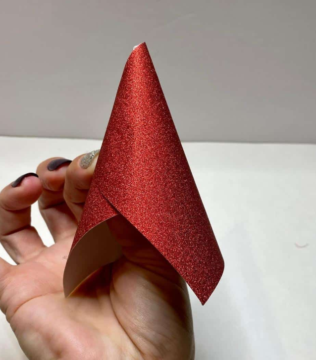 -빨간 글리터 종이를 원뿔 모양으로 말아 모자를 만들고, 아래쪽 여분을 잘라냅니다.