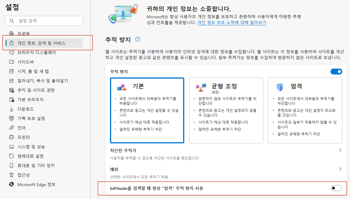 아래 개인정보 검색 및 서비스에서 'inPrivate를 검색할 때 엄격 추적방지 사용' 추적 방지 기능을 꺼주세요