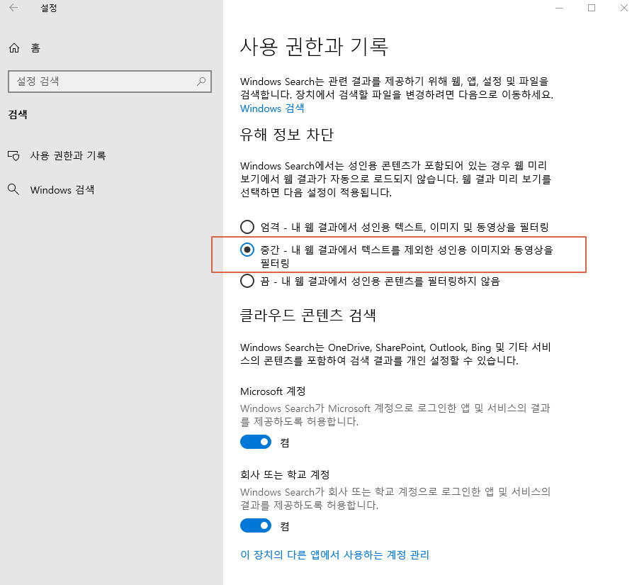 2.. 두번째 방법 윈도우>설정>사용권한과 기록> 유해정보차단 기능을 끔