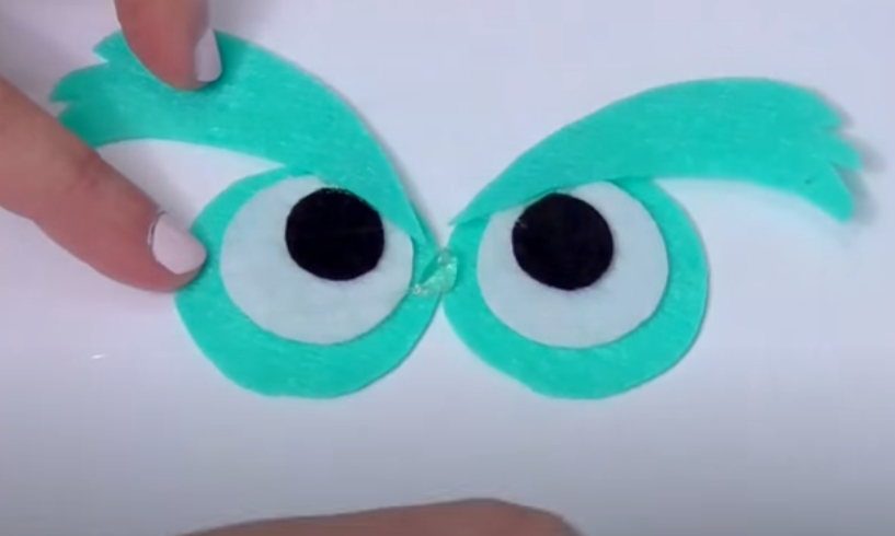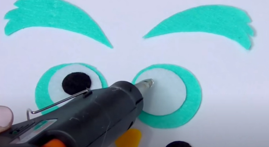 4. 글루건을 이용하여 다름 사진과 같이 각 눈을 완성해 주세요, 같은 방식으로 날개등의 무늬도 글루건으로 완성해 주시면 됩니다. 3마리의 부엉이 펠트 조각을 모두 붙여주세요.