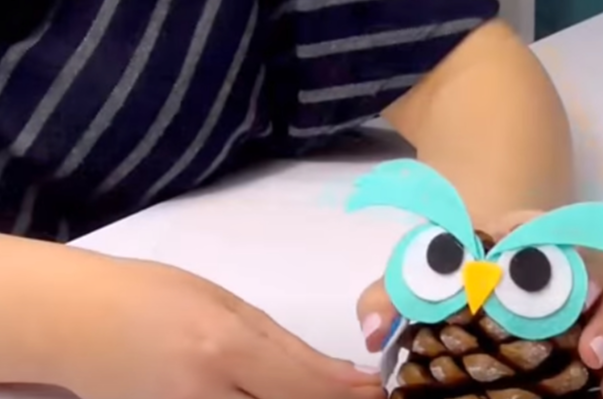 7. 글루건으로 1차 조립된 펠트 부속의 눈과 날개 등을 다시 글루건을 이용하여 솔방울에 붙여주세요
